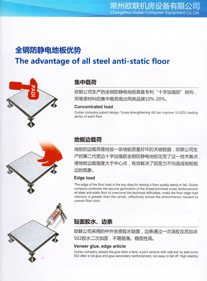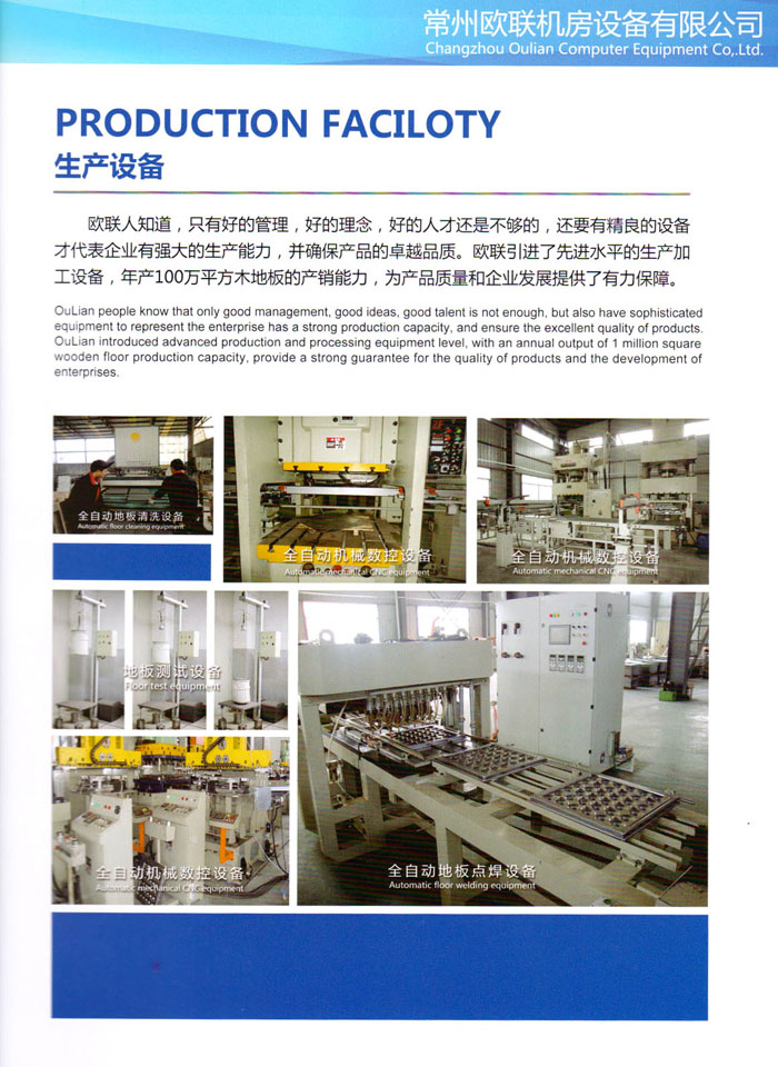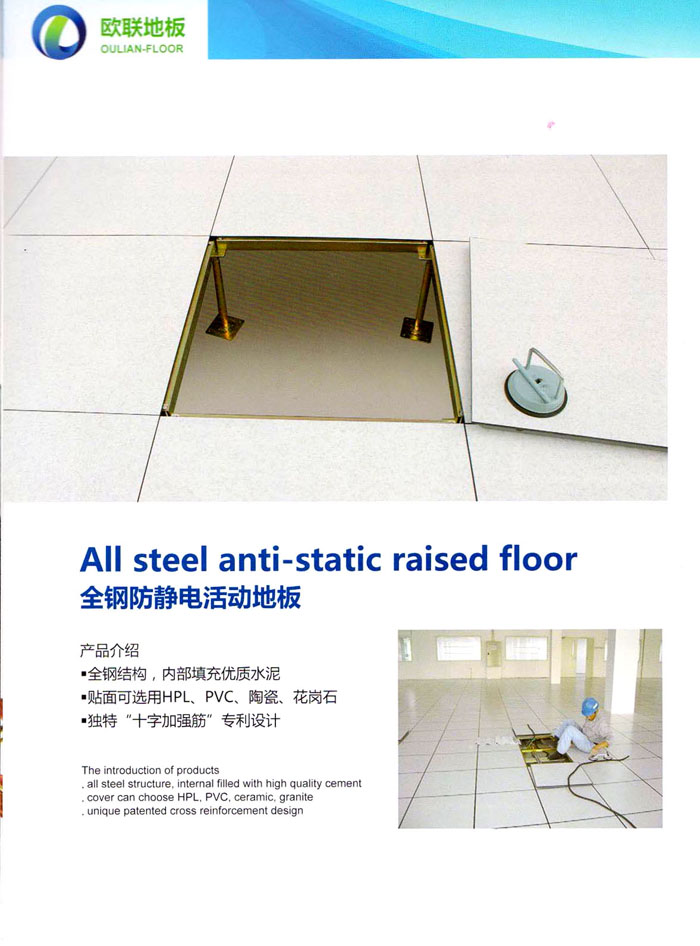 防靜電高架活動地板、全鋼地板、陶瓷地板是計算機行業(yè)發(fā)展起來的新型鋪地材料,隔離了潮氣、靜電灰塵,最重要的是解決了綜合布線問題,無需預埋管線,可隨時拆卸、搬移,保證了資訊設備完整的優(yōu)點,適應了智能化樓宇中信息自動化技術(shù)對所處環(huán)境的特定要求,避免了廣大客戶的雙重投資,使現(xiàn)代化辦公程度更加高效,辦公場所更加舒適。 “歐聯(lián)”系列全鋼地板,符合國家安全要求,種類完備多樣,其中防靜電陶瓷地板、硫酸鈣地板等除具有普通瓷質(zhì)的裝飾和實用性外,其耐磨、防水、防火功能優(yōu)于其它同類產(chǎn)品,防靜電系列地板,能切合不同客戶的要求,其靈活的配置,深受客戶歡迎,不同材質(zhì)的地板結(jié)構(gòu)使設計師的設計空間比傳統(tǒng)的更加廣闊自由和善變。 公司大力發(fā)展國內(nèi)外銷售業(yè)務,多次中標國內(nèi)重點工程 ,例:哈爾濱醫(yī)科大學、山東大學、上海普通機場等。 公司將一如既往開發(fā)和制造一流的產(chǎn)品,愿與廣大有識之士合作發(fā)展,共創(chuàng)美好未來。
