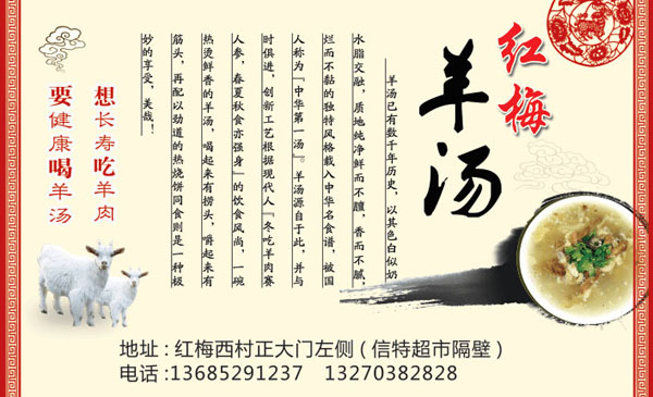 天寧區(qū)紅梅奧彩小吃店(紅梅羊湯店)成立十四年,特色是羊湯, 羊肉是中國(guó)人民食用的主要肉類之一.羊肉比其他肉類的肉質(zhì)要細(xì)嫩,而且膽固醇含星低。相對(duì)其他肉類而言,羊肉蛋白質(zhì)含量較多,脂肪含量較少。維生素B1、B2、B6以及鐵、鋅、硒的含量頗為豐富。此外,羊肉肉質(zhì)細(xì)嫩容易消化吸收.多吃羊肉有助于提高身體免疫力。 羊肉熱量比牛肉要高.中醫(yī)認(rèn)為,羊肉具有補(bǔ)精血,益虛勞.溫中健脾,補(bǔ)腎壯陽(yáng),養(yǎng)薛等功能,尤其適合老年人、體虛的人群食用。 羊肉的大部分脂肪都可看得見,很容易去除。羊腿部肉、肋骨和腰部肉比肩胛肉瘦。每100克烤羊腿中.含蛋白質(zhì)28克、脂肪7克、膽固醇100毫克.能提供的熱量是757.7千焦。 羊羔肉富含蛋白質(zhì)、鋅和維生素B族,其中煙酸、維生素B2和維生素B12的含量壟基圭富.羊羔肉中鎂、鉀和磷的含量也較高,并易于吸收。