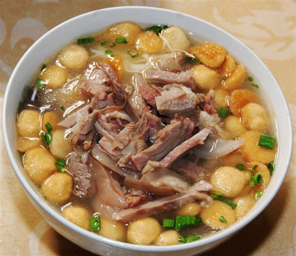 牟利英走進廚房給客人盛羊湯,只見她在漏勺里放入百葉絲和豆炙餅,入鍋燙熟,倒入一只大碗,再倒入一碟羊雜碎,然后舀起一勺篤得奶白的羊骨頭湯,手腕一翻倒入碗里,熱騰騰、香噴噴的一碗羊湯就做好了,此時別忘了往湯里扔一小撮碧綠生青的蒜葉提香。趁熱喝,從嘴里一直熱到胃里,就連整個人似乎也跟著暖熱了起來。談旭東在一邊說,他小時候,羊肉館里用的豆炙餅還是自家熯的(熯,音同“漢”,意為焙或用極少的油煎),現(xiàn)在雖說是別人供貨的,但也算是特制的,要關(guān)照多熯一會兒,這樣才不會一下鍋就篤爛,拿回家后,他還要再用油爆香,放在湯里才更好吃。