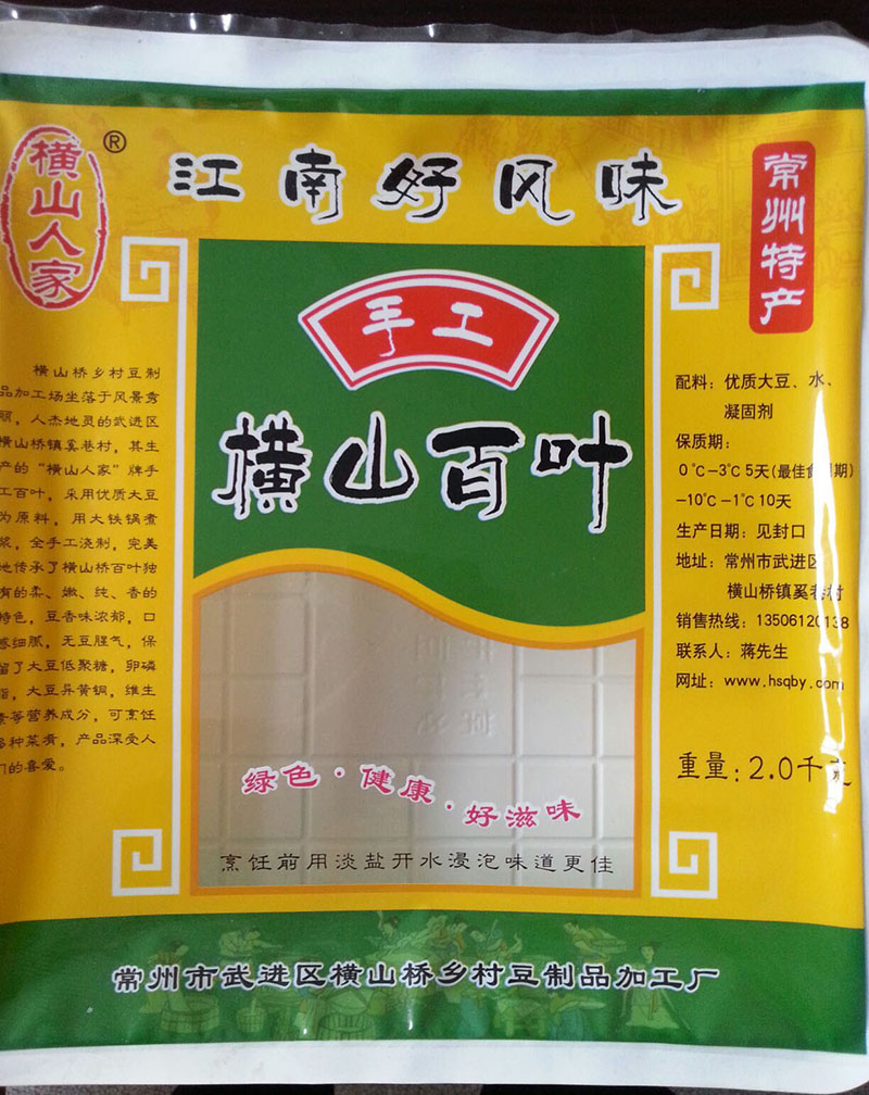 橫山橋鄉(xiāng)村豆制品加工場坐落于風(fēng)景秀麗,人杰地靈的武進區(qū)橫山橋鎮(zhèn)奚巷村,其生產(chǎn)的“橫山人家”牌手工百葉,采用優(yōu)質(zhì)大豆為原料,用大鐵鍋煮漿,全手工澆制,完美地傳承了橫山橋百葉獨有的柔、嫩、純、香的特色,豆香味濃郁,口感細膩,無豆腥氣,保留了大豆低聚糖,卵磷脂,大豆異黃銅,維生素等營養(yǎng)成分,可烹飪多種菜肴。產(chǎn)品主要銷往上海、南京以及常武地區(qū)的各大飯店,深受人們的喜愛。 多年來,我們積極倡導(dǎo)“誠信如同生命,口碑重于泰山”的經(jīng)營理念,高度重視產(chǎn)品質(zhì)量和衛(wèi)生,力爭讓“橫山人家”品牌豆制品成為消費者最安全!最貼心!最認(rèn)可的橫山橋百葉品牌。