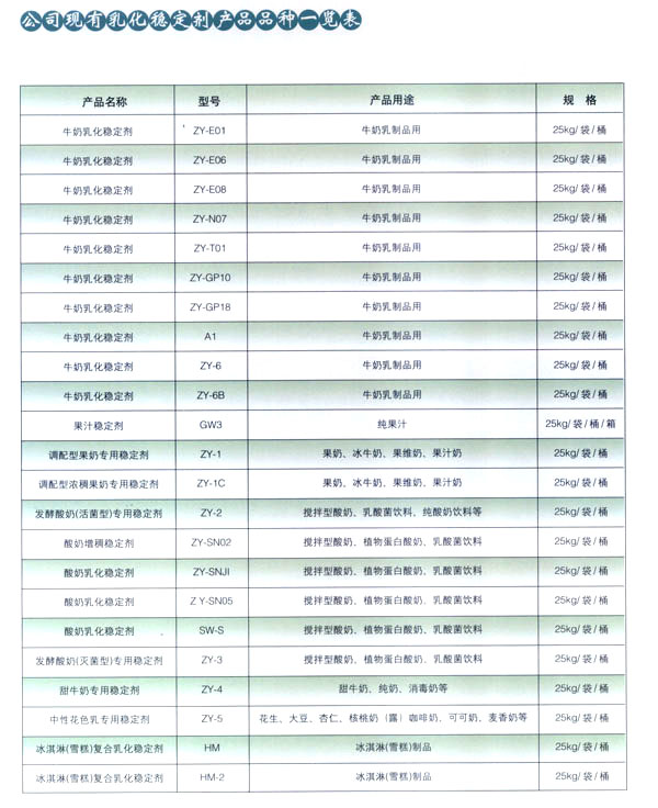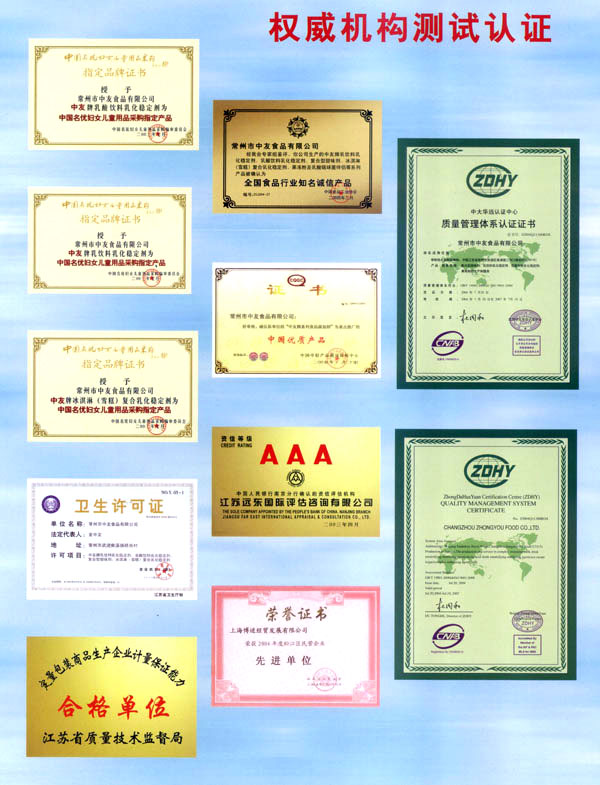 常州市中友食品有限公司;匚挥诔V菔袞|郊開發(fā)區(qū),廠房占地面積6000平方米,擁有全新的生產(chǎn)線,先進(jìn)的生產(chǎn)流程和嚴(yán)格的質(zhì)量管理體系(工廠已通過IS09001:2000質(zhì)量管理體系的認(rèn)證)。并有專業(yè)的技術(shù)開發(fā)和理化檢驗(yàn)的設(shè)施、經(jīng)驗(yàn)豐富的技術(shù)人員。公司以科技為依托,常年與高等院校合作,不斷地開發(fā)和研制適合市場(chǎng)需求的食品添加劑系列產(chǎn)品。公司每年面向全國(guó)招收優(yōu)秀的博士、碩士及優(yōu)秀的大學(xué)生。公司現(xiàn)有員工1 00多人,管理人員2 0名、高工5名、產(chǎn)品專業(yè)技術(shù)開發(fā)人員12名,還有選擇地引進(jìn)和代理國(guó)內(nèi)外各種適用的食品添加劑。 依靠本公司雄厚的科技力量和先進(jìn)的科技設(shè)備,生產(chǎn)基地已經(jīng)具備了與客戶共同開發(fā)國(guó)內(nèi)外先進(jìn)食品添加劑的應(yīng)用技術(shù)。博適中友公司多年來致力于食品添加劑的研究和開發(fā),突破常規(guī)理念,以市場(chǎng)、用戶為中心,研究開發(fā)各個(gè)品種、各個(gè)檔次的食品添加劑,品種齊全又多樣,既有出口型又有內(nèi)銷型。公司主要穩(wěn)定劑產(chǎn)品有:乳飲料乳化穩(wěn)定劑、乳酸飲料乳化穩(wěn)定劑、冰淇淋(雪糕)復(fù)合乳化穩(wěn)定劑、果汁飲料乳化穩(wěn)定劑等,產(chǎn)品暢銷國(guó)內(nèi)外,覆蓋了全國(guó)二十多個(gè)省市,并建立了穩(wěn)定的銷售網(wǎng)絡(luò)。 本公司對(duì)產(chǎn)品指定了嚴(yán)格的質(zhì)量標(biāo)準(zhǔn),并報(bào)請(qǐng)常州市技術(shù)檢驗(yàn)監(jiān)督局審核批準(zhǔn),其技術(shù)要求完全符合GB一2760(食品添加劑使用衛(wèi)生標(biāo)準(zhǔn))和符合聯(lián)合國(guó)直接衛(wèi)生組織(WHO)、聯(lián)合國(guó)食品與農(nóng)業(yè)組織(FAO)以及美國(guó)食品和藥物管理局的有關(guān)規(guī)定。 長(zhǎng)期以來,博適中友公司以市場(chǎng)定位為基本依據(jù),堅(jiān)持發(fā)展并開辟多元化的國(guó)內(nèi)外市場(chǎng):以專業(yè)化、長(zhǎng)遠(yuǎn)化、規(guī)模化為經(jīng)營(yíng)思路:以開拓創(chuàng)新,務(wù)實(shí)誠信為經(jīng)營(yíng)理念,不斷促進(jìn)企業(yè)發(fā)展壯大。 公司自創(chuàng)建以來,始終不渝地堅(jiān)持質(zhì)量第一、信譽(yù)至上,以精湛的工藝加工產(chǎn)品,不管是標(biāo)準(zhǔn)的或特制的都可享有本公司優(yōu)良的技術(shù)服務(wù)。無論您需要何種功能性添加劑,博適中友食品添加劑公司均能滿足您的要求。博適中友公司以價(jià)格合理、服務(wù)周到為經(jīng)營(yíng)宗旨,努力引導(dǎo)食品添加劑應(yīng)用發(fā)展的新潮流、新方向。在才能卓越的領(lǐng)導(dǎo)者的帶領(lǐng)下,全體員工以開拓、創(chuàng)新、求實(shí)、守信為企業(yè)精神,不斷地提高自身的素質(zhì)。 公司的宗旨是“開拓創(chuàng)新發(fā)展、精誠服務(wù)和諧”為目標(biāo),熱忱與各界有識(shí)之士攜手共進(jìn),共創(chuàng)輝煌!如今公司業(yè)務(wù)蒸蒸日上,專業(yè)技術(shù)研究越走越精,這都與廣大客戶大力支持分不開。在新世紀(jì)來臨之際,上海博適中友公司愿與您真誠合作,攜手并進(jìn),共鑄新的輝煌!