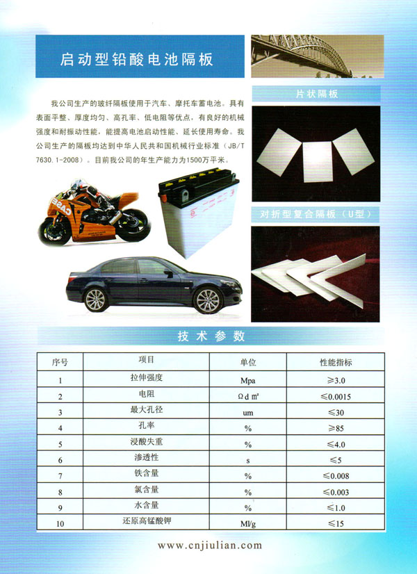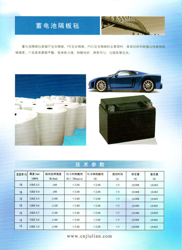 常州市久聯(lián)蓄電池材料有限公司位于經(jīng)濟(jì)發(fā)達(dá)、交通便捷、景色優(yōu)美的江蘇省常州市戚墅堰區(qū),成立于2001年,是專業(yè)從事各種電池隔板、隔膜材料和玻纖氈的生產(chǎn)廠家。產(chǎn)品主要有啟動(dòng)型蓄電池玻纖復(fù)合隔板、玻纖氈、鋰錳扣式、鋰亞電池用玻纖電池隔膜。產(chǎn)品均已通過(guò)ISO9001:2008認(rèn)證,產(chǎn)品廣泛使用于國(guó)外多家電池制造廠家,并獲得了一致好評(píng)。 目前我公司有兩條隔板生產(chǎn)線,一條隔膜生產(chǎn)線和一條玻氈生產(chǎn)線。