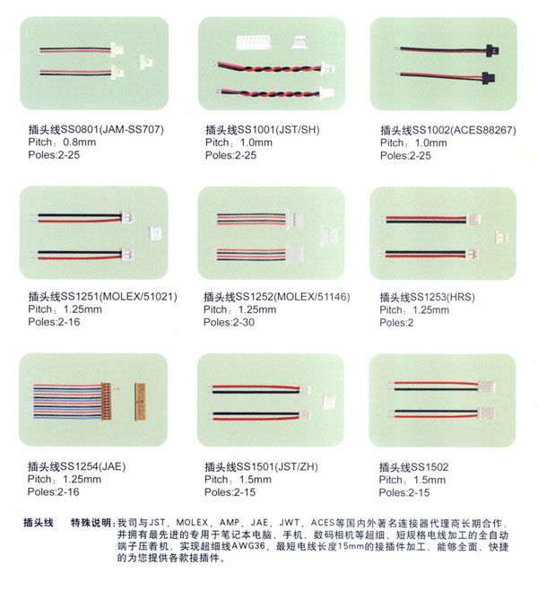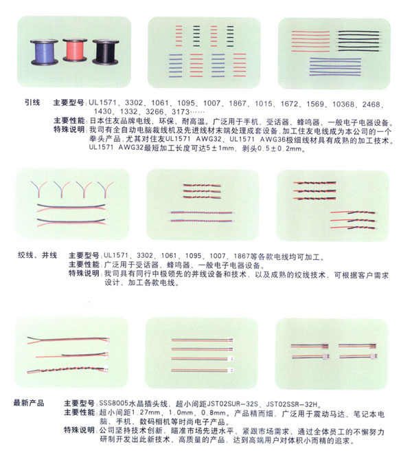 常州市匯創(chuàng)電子有限公司我公司2000年8月成立.端子連接線生產(chǎn)有10余年的經(jīng)驗(yàn).結(jié)合韓國(guó)連接線生產(chǎn)技術(shù),致力于筆記本電腦,手機(jī),數(shù)碼相機(jī)等高端行業(yè)的小間距的端子連接線的研究和生產(chǎn).小間距端子連接線的插頭的常規(guī)型號(hào)有 SH/1.0mm, 51021-0200/1.25mm, ZH , PH, EH, XH, SAN, SCN, 2510 等.特殊插頭型號(hào)有:02SUR-32S,02SSR-32H.材料用原廠進(jìn)口的JST, MOLEX,或臺(tái)資廠家的(根據(jù)客戶需要).全環(huán)保,無(wú)鉛化生產(chǎn).2008年開(kāi)始導(dǎo)入無(wú)鹵素要求。企業(yè)已經(jīng)通過(guò)ISO9001-2000質(zhì)量管理體系.質(zhì)量好!交貨快!價(jià)格合理!是目前常州AAC等多家大型受話器廠家的優(yōu)秀供應(yīng)商.客戶遍及常州周邊,蘇州,昆山,上海,深圳,嘉興,山東,重慶等地.也有直接出口韓國(guó),臺(tái)灣.現(xiàn)有高素質(zhì)員工100人左右.廠房面積2000平方米.