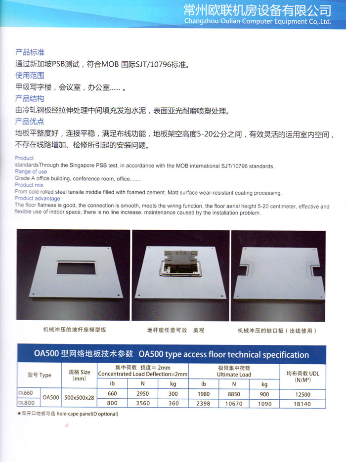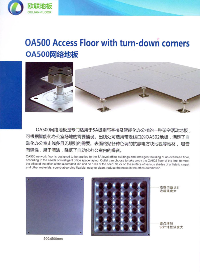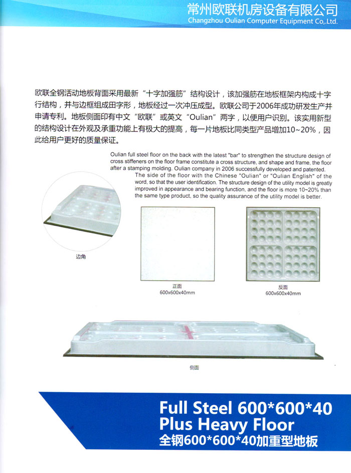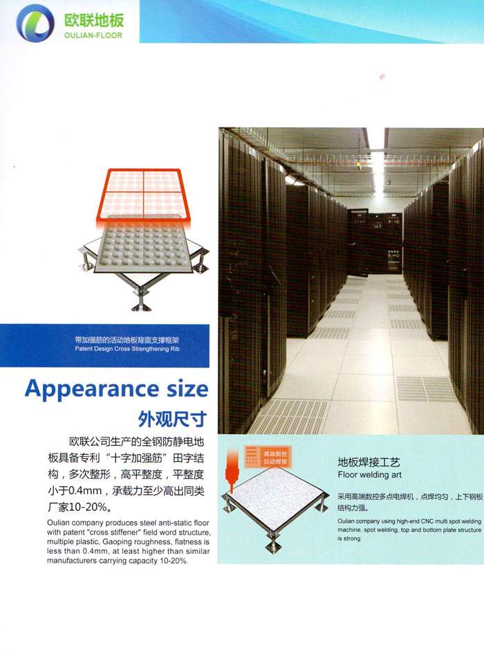 防靜電高架活動(dòng)地板、全鋼地板、陶瓷地板是計(jì)算機(jī)行業(yè)發(fā)展起來的新型鋪地材料,隔離了潮氣、靜電灰塵,最重要的是解決了綜合布線問題,無需預(yù)埋管線,可隨時(shí)拆卸、搬移,保證了資訊設(shè)備完整的優(yōu)點(diǎn),適應(yīng)了智能化樓宇中信息自動(dòng)化技術(shù)對(duì)所處環(huán)境的特定要求,避免了廣大客戶的雙重投資,使現(xiàn)代化辦公程度更加高效,辦公場(chǎng)所更加舒適。 “歐聯(lián)”系列全鋼地板,符合國家安全要求,種類完備多樣,其中防靜電陶瓷地板、硫酸鈣地板等除具有普通瓷質(zhì)的裝飾和實(shí)用性外,其耐磨、防水、防火功能優(yōu)于其它同類產(chǎn)品,防靜電系列地板,能切合不同客戶的要求,其靈活的配置,深受客戶歡迎,不同材質(zhì)的地板結(jié)構(gòu)使設(shè)計(jì)師的設(shè)計(jì)空間比傳統(tǒng)的更加廣闊自由和善變。 公司大力發(fā)展國內(nèi)外銷售業(yè)務(wù),多次中標(biāo)國內(nèi)重點(diǎn)工程 ,例:哈爾濱醫(yī)科大學(xué)、山東大學(xué)、上海普通機(jī)場(chǎng)等。 公司將一如既往開發(fā)和制造一流的產(chǎn)品,愿與廣大有識(shí)之士合作發(fā)展,共創(chuàng)美好未來。