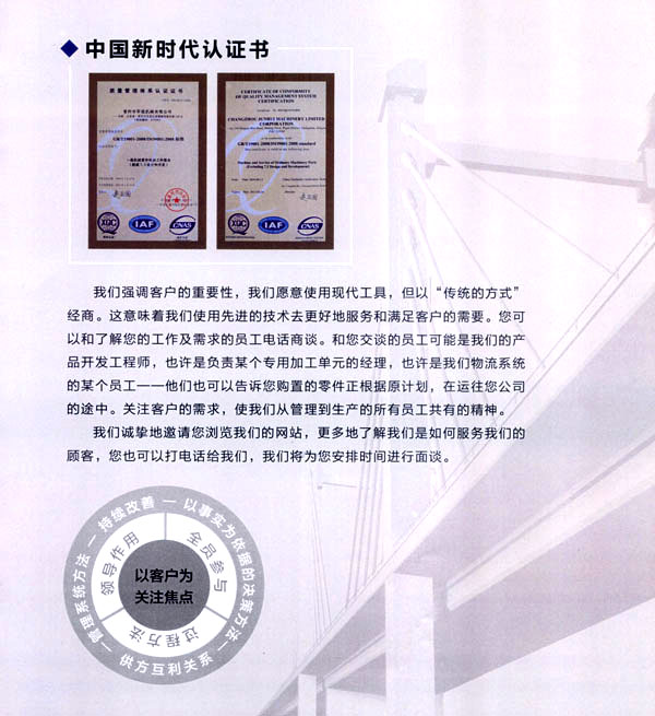 公司于2007年6月通過(guò)IS09001質(zhì)量體系認(rèn)證。本著信譽(yù)第一,誠(chéng)實(shí)合作,嚴(yán)格管理為服務(wù)宗旨,全員參與、持續(xù)改善。提升品質(zhì)、準(zhǔn)時(shí)交貨、客戶滿意的質(zhì)量方針。為客戶提供優(yōu)質(zhì)的產(chǎn)品,周到的服務(wù)。嚴(yán)格的品質(zhì),快捷的送貨,完善的生產(chǎn)設(shè)備,一流的技術(shù),使公司在同行業(yè)中占有一席之地。