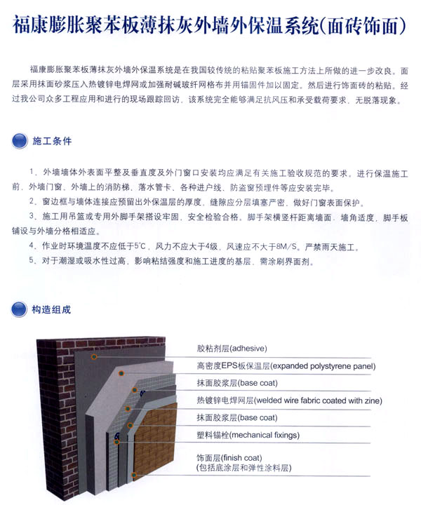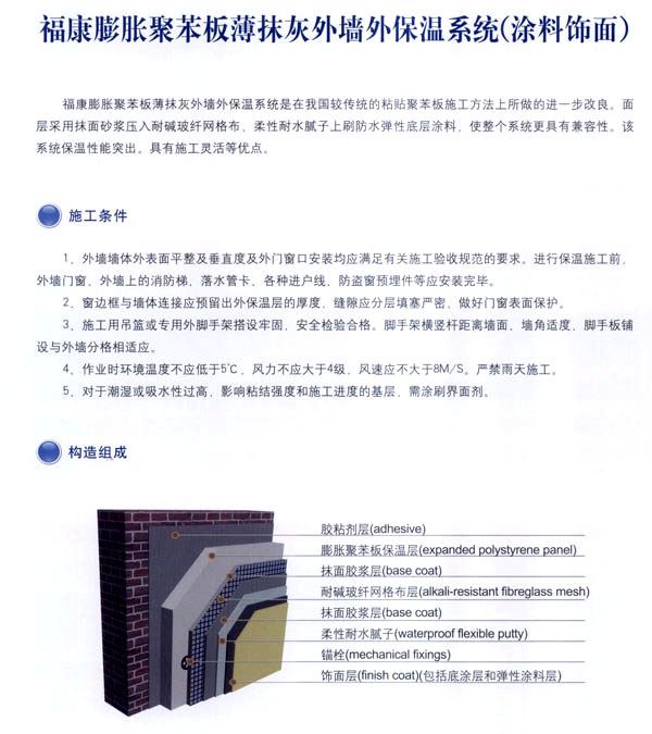 常州市?敌滦徒ú挠邢薰臼且匝兄崎_(kāi)發(fā)、生產(chǎn)、銷售、施工、技術(shù)服務(wù)為一體的化學(xué)建筑材料的專業(yè)企業(yè),通過(guò)與歐洲著 名建筑材料公司和國(guó)內(nèi)權(quán)威科研機(jī)構(gòu)合作,并聘請(qǐng)國(guó)家級(jí)專家為技術(shù)顧問(wèn),開(kāi)發(fā)出適合我國(guó)市場(chǎng)的福康EPS、XPS及聚苯顆粒外墻外保溫節(jié)能系統(tǒng)。 公司的生產(chǎn)線全部采用國(guó)內(nèi)先進(jìn)的電腦控制自動(dòng)化設(shè)備,配備了專業(yè)的實(shí)驗(yàn)中心,并且采用進(jìn)口的可再分散乳膠粉為基料,確保福康外墻外保溫節(jié)能系統(tǒng)具有性能優(yōu)異、安全可靠,綠色環(huán)保、適用性強(qiáng)的高品質(zhì)特點(diǎn)。 公司開(kāi)發(fā)的\'?低鈮ν獗叵到y(tǒng)\'被列為江蘇省科技成果推廣項(xiàng)目。整個(gè)生產(chǎn)流程依照質(zhì)量體系的要求,實(shí)行嚴(yán)格的監(jiān)控和檢測(cè),為生產(chǎn)優(yōu)質(zhì)產(chǎn)品提供保證。高品質(zhì)的福康外墻外保溫系統(tǒng),提供從熱工設(shè)計(jì)、產(chǎn)品開(kāi)發(fā)、生產(chǎn)銷售及工程施工全程服務(wù)的一體化解決方案。 公司本著“綠色環(huán)保、節(jié)約能源、造福人類”的理念。用我們一流的產(chǎn)品和優(yōu)秀的服務(wù),打造出一個(gè)個(gè)節(jié)能康居示范工程,為人類營(yíng)造出舒適健康的居住環(huán)境。我們?cè)笧橹袊?guó)節(jié)能事業(yè)的發(fā)展積極努力,更上一層樓。 公司組建高效的生產(chǎn)經(jīng)營(yíng)管理模式,設(shè)立專業(yè)技術(shù)服務(wù)機(jī)構(gòu)。配備售后的優(yōu)質(zhì)服務(wù)。實(shí)行原材料、運(yùn)輸、安裝一條龍服務(wù)。經(jīng)本公司施工之后,貴公司可以直接批涂料、裝門窗、貼瓷磚,保證絕無(wú)任何質(zhì)量問(wèn)題。