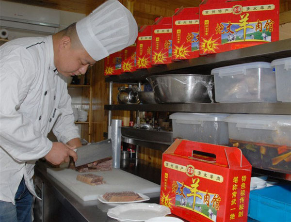 談家的羊肉館位于鄭陸老街上,深秋的一天,記者來到這家羊肉館,穿過大堂走到廚房里,幾名工人正在忙著處理羊肉。余菊華穿著大紅色的薄毛衣,坐在桌子旁,正在麻利地剔著羊肉上的肥油。她是羊肉館的老一代老板娘,如今和老伴談仲興一起,仍天天來店里幫著兒子談旭東打下手。余阿姨隨手拿過一塊長方形的肉皮,用一把小刮刀撳在上面,輕輕地刮著,一團(tuán)團(tuán)白白的油被剔了下來,堆在一邊!拔壹业难蛉馀酶蓛舻,腿上的肥肉還有筋筋拉拉的東西,全都要弄掉,就是自己家買了豬肉燒紅燒肉,也不可能弄到這么干凈的,F(xiàn)在的客人都怕胖,所以一定要處理得干干凈凈!庇喟⒁陶f。剔好的肉皮是用來熬成皮凍然后混和著羊肉壓制成羊糕的,只有清理得干凈,沒有一點(diǎn)雜質(zhì),羊糕的質(zhì)量才會(huì)好。