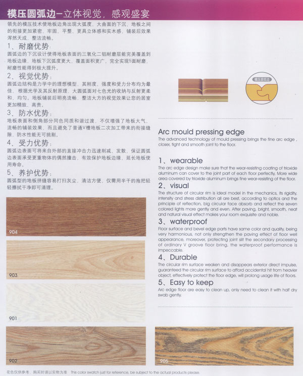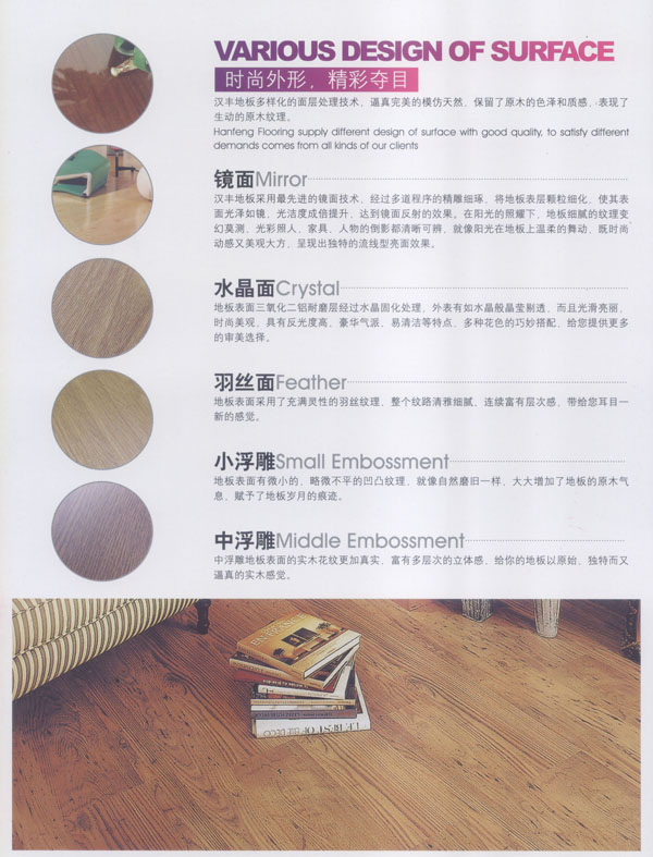 常州漢豐裝飾材料有限公司是一家涉及強(qiáng)化地板制造、屏風(fēng)鋁材生產(chǎn)、進(jìn)出口貿(mào)易的大型公司。2001年公司投入重資.全面引進(jìn)世界頂級(jí)一體化自動(dòng)流水生產(chǎn)線和具有國(guó)際先進(jìn)水準(zhǔn)的德國(guó)權(quán)威木地板生產(chǎn)技術(shù),興建強(qiáng)化地板生產(chǎn)基地。多年以來(lái).一直不斷加強(qiáng)生產(chǎn)設(shè)備、廠房基礎(chǔ)投入,目前公司年生產(chǎn)強(qiáng)化地板能力已經(jīng)達(dá)到了500萬(wàn)平方米,步入國(guó)內(nèi)一流行列,具備了雄厚的國(guó)際競(jìng)爭(zhēng)力。 漢豐地板以奉獻(xiàn)生活中最完美的地板為發(fā)展目標(biāo),時(shí)尚流行的設(shè)計(jì)風(fēng)格和多樣化的產(chǎn)品類型,贏得了市場(chǎng)的廣泛贊譽(yù)和肯定。產(chǎn)品嚴(yán)格按照歐洲標(biāo)準(zhǔn)檢測(cè)強(qiáng)化木地板的各項(xiàng)性能指標(biāo).達(dá)到百分百的國(guó)際技術(shù)標(biāo)準(zhǔn),確保了每一塊地板都有著上乘品質(zhì),是綠色環(huán)保的好地板。并先后通過(guò)了Isc)9001國(guó)際質(zhì)量管理體系認(rèn)證,IS014001國(guó)際環(huán)境管理體系認(rèn)證.中國(guó)環(huán)境標(biāo)志產(chǎn)品認(rèn)證,深得用戶的一致好評(píng),是寫字樓、商場(chǎng)、大型超市、學(xué)校、建筑樓宇、娛樂(lè)場(chǎng)所、家用私宅等鋪裝的首選地板。