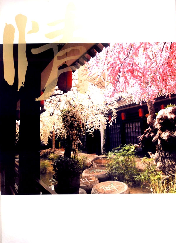 古木新枝畔賓客對酒當歌,溪泉石椅旁把茶品啜。