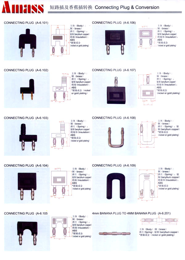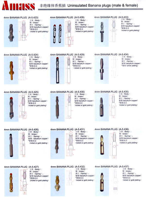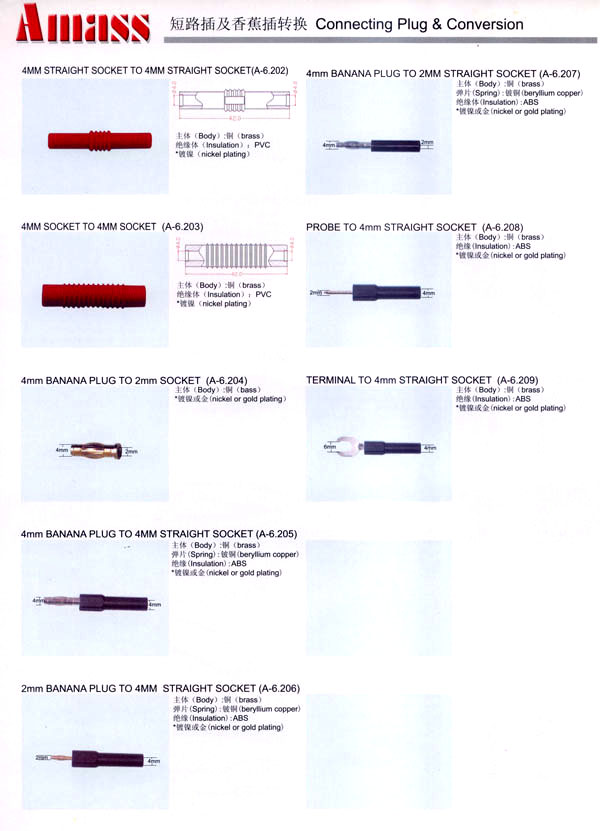 本公司專業(yè)生產(chǎn)各類香蕉插頭,香蕉插座,接線柱,電瓶夾,鱷魚夾,測試導線,測試筆等。產(chǎn)品分2mm/2.5mm/3mm/3.5mm/4mm五大系列,百余種款式, 各種香蕉插廣泛用于儀器、儀表、電力測試、教學、玩具,視聽設備、醫(yī)療儀器,保健產(chǎn)品等領域。公司技術力量雄厚,生產(chǎn)工藝先進,產(chǎn)品遠銷港、臺、歐美,并與飛利浦等國際品牌配套。公司本著精益求精的理念,歡迎新老客戶光臨。 我們擁有資深的工程師和豐富的電子產(chǎn)品銷售經(jīng)驗,專業(yè)生產(chǎn)各類電子接插件產(chǎn)品。 香蕉插頭,香蕉插座,電瓶夾,鱷魚夾等品種齊全、 質(zhì)量可靠,致力服務于通訊、數(shù)據(jù)通信、消費類電子產(chǎn)品、計算機和計算機外圍設備以及工業(yè)應用等領域,能給客戶提供全面采購解決方案。 我們秉承穩(wěn)健作風、誠實經(jīng)營、合理價格、完善服務的宗旨,在全體客戶的支持下,公司不斷創(chuàng)新進取,業(yè)績蒸蒸日上,已與數(shù)十家電子零件制造商及其分支機構建立密切合作關系,在國內(nèi)擁有數(shù)百家固定客戶。