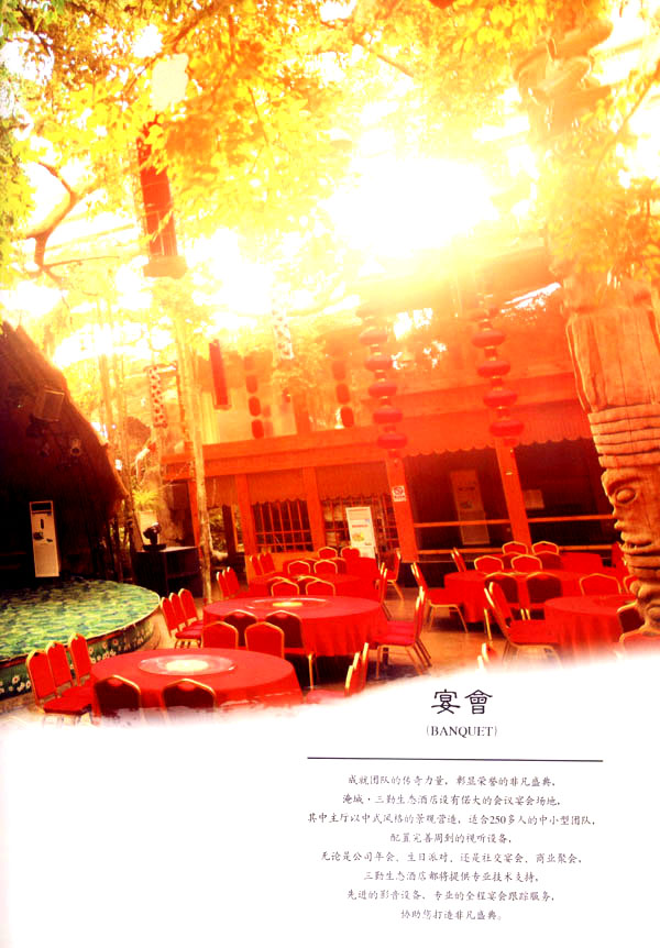 淹城花都溫泉水城孕育天地之精華,悅身、悅?cè)荨傂、悅神。置身其中泉水潺潺,霧氣繚繞、花瓣飄香,恍若仙境。“掬水月在手,弄花香滿衣”,花都溫泉的浪漫與溫潤在這里完美展現(xiàn)。 花都溫泉水城包括洗浴區(qū)、戲水世界、露天溫泉、自助餐廳、生態(tài)房、別墅區(qū)、紅文化房、VIP區(qū)等多種功能區(qū)域,是集溫泉養(yǎng)生、休閑住宿、演藝會務(wù)為—體的休閑度假勝地,給賓客帶來江南小鎮(zhèn)的浪漫水城之旅。 古木新枝畔賓客對酒當(dāng)歌,溪泉石椅旁把茶品啜。 淹城-三勤生態(tài)酒店,這里是一處綠色生態(tài)的美食家園。此地鬼斧神工.奇水異石,和風(fēng)細(xì)雨林中穿過,引百鳥朝來暮歌;這里集生態(tài)餐飲、演藝、中小型會務(wù)為一體,將現(xiàn)代裝飾風(fēng)格和古雅拙樸的自然裝修完美整合;這里聚集大江南北名廚,推出精致綠色美昧佳肴。來到這里,賓客可享田園至美之景,品舌尖至鮮之味,實(shí)乃人生一大樂事。