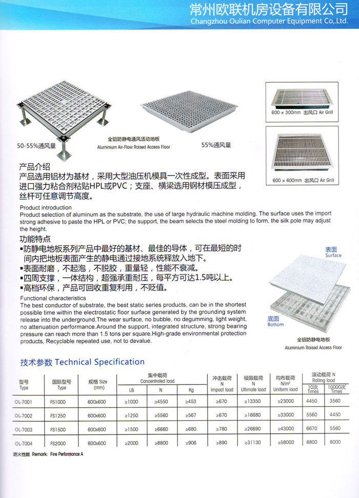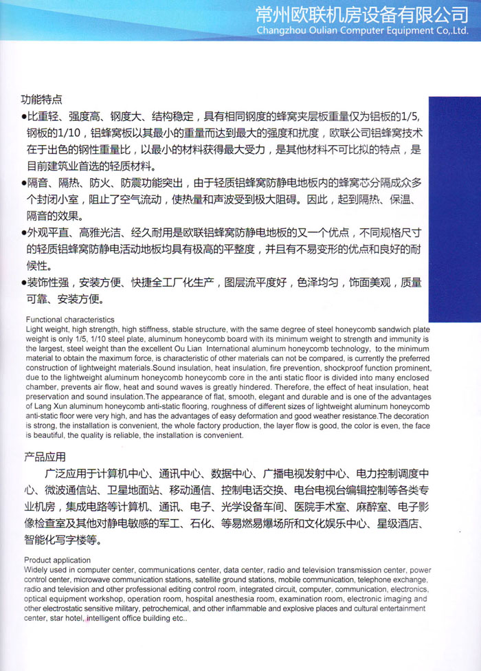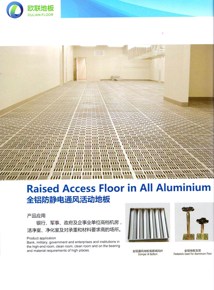 防靜電高架活動地板、全鋼地板、陶瓷地板是計算機行業(yè)發(fā)展起來的新型鋪地材料,隔離了潮氣、靜電灰塵,最重要的是解決了綜合布線問題,無需預(yù)埋管線,可隨時拆卸、搬移,保證了資訊設(shè)備完整的優(yōu)點,適應(yīng)了智能化樓宇中信息自動化技術(shù)對所處環(huán)境的特定要求,避免了廣大客戶的雙重投資,使現(xiàn)代化辦公程度更加高效,辦公場所更加舒適。 “歐聯(lián)”系列全鋼地板,符合國家安全要求,種類完備多樣,其中防靜電陶瓷地板、硫酸鈣地板等除具有普通瓷質(zhì)的裝飾和實用性外,其耐磨、防水、防火功能優(yōu)于其它同類產(chǎn)品,防靜電系列地板,能切合不同客戶的要求,其靈活的配置,深受客戶歡迎,不同材質(zhì)的地板結(jié)構(gòu)使設(shè)計師的設(shè)計空間比傳統(tǒng)的更加廣闊自由和善變。 公司大力發(fā)展國內(nèi)外銷售業(yè)務(wù),多次中標國內(nèi)重點工程 ,例:哈爾濱醫(yī)科大學、山東大學、上海普通機場等。 公司將一如既往開發(fā)和制造一流的產(chǎn)品,愿與廣大有識之士合作發(fā)展,共創(chuàng)美好未來。