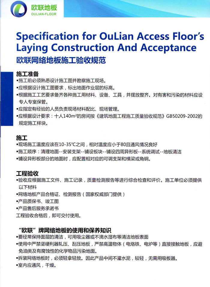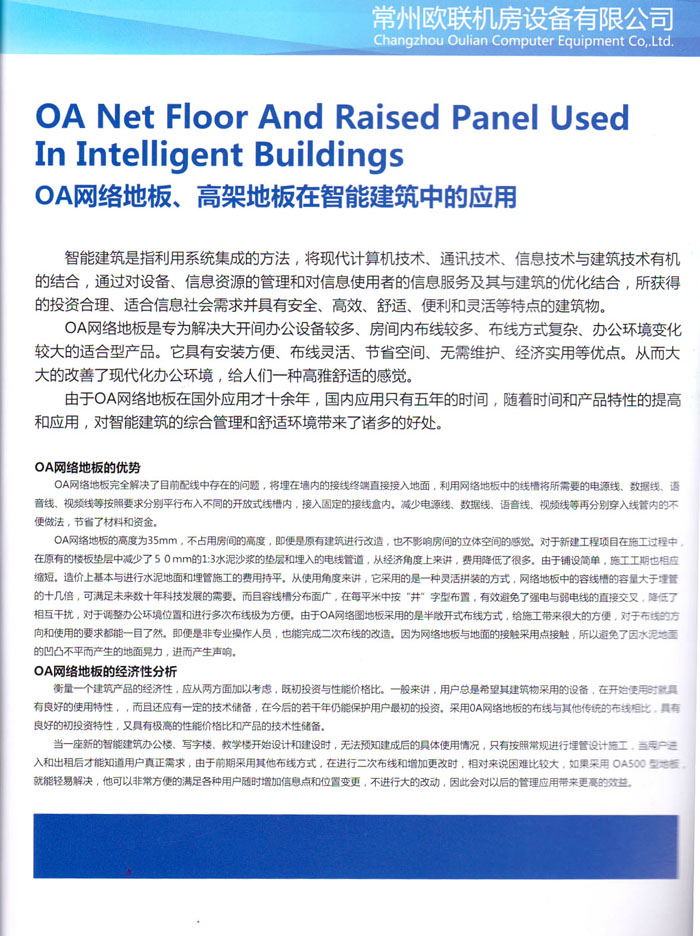 “歐聯(lián)”系列全鋼地板,符合國家安全要求,種類完備多樣,其中防靜電陶瓷地板、硫酸鈣地板等除具有普通瓷質(zhì)的裝飾和實(shí)用性外,其耐磨、防水、防火功能優(yōu)于其它同類產(chǎn)品,防靜電系列地板,能切合不同客戶的要求,其靈活的配置,深受客戶歡迎,不同材質(zhì)的地板結(jié)構(gòu)使設(shè)計師的設(shè)計空間比傳統(tǒng)的更加廣闊自由和善變。